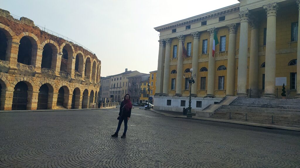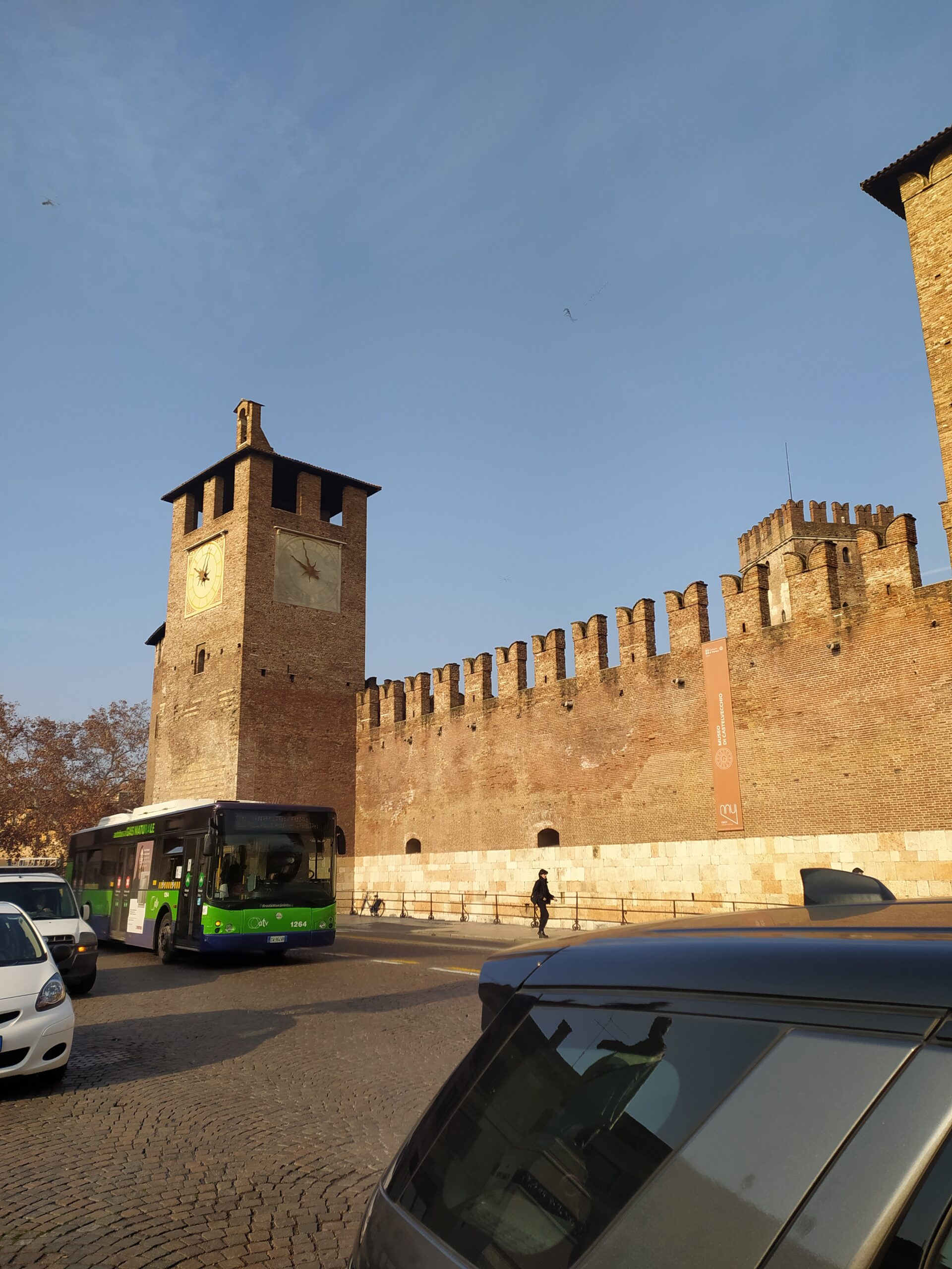 A hatalmas városfal mentén haladva pedig meg is pillantottam Verona „Colosseum-át” a veronai arénát (Arena di Verona). Hasonlóképpen a „nagy tesóhoz” kb. 2000 évvel ezelőtt itt is gladiátorok küzdöttek egymással, később színházzá alakították, ma pedig otthont ad az évenként megrendezett Veronai Operafesztiválnak.