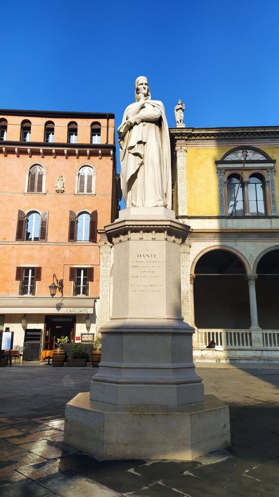 Egy boltíven át elértük rögtön a Piazza dei Signori-t, melynek közepén egy Dante emlékmű áll. A reneszánsz palotákkal körülölelt tér – melynek egyike a Városháza – egészen elbűvölő, bár hozzá teszem a séta ezen szakaszain nekem egyből eszembe jutottak olyan filmjelenetek is, ahol a középkorban a városok főterén végeztek ki embereket, mikor kicsit testközeli a hatás már nem annyira tűnik távolinak a középkor sem. Néha elképzelem, hogy vajon nemesi vagy koldusi családban volt e békésebb az élet, abban sajnos biztos vagyok, hogy nem agg leányzóként végeztem volna azokban az évszázadokban.