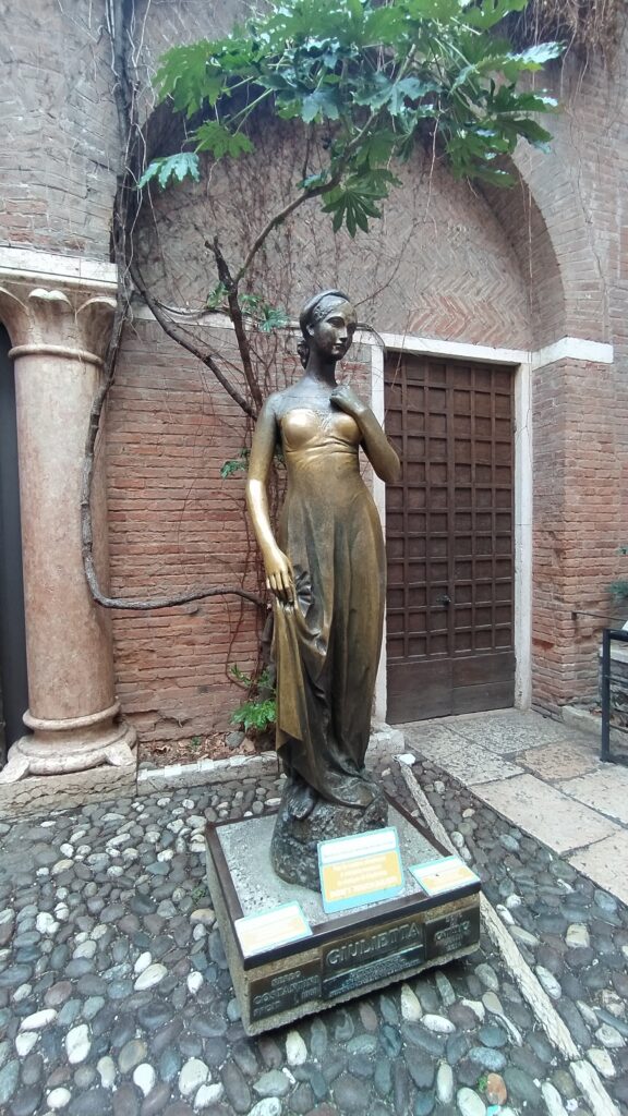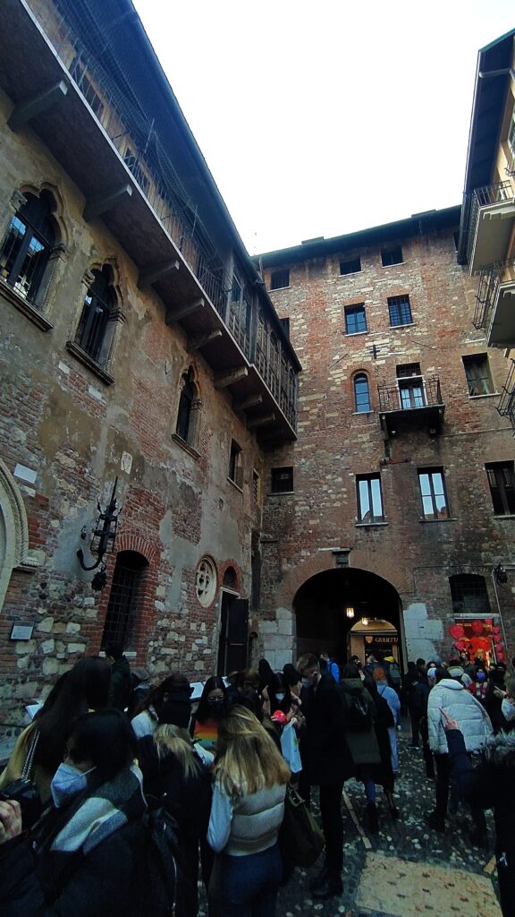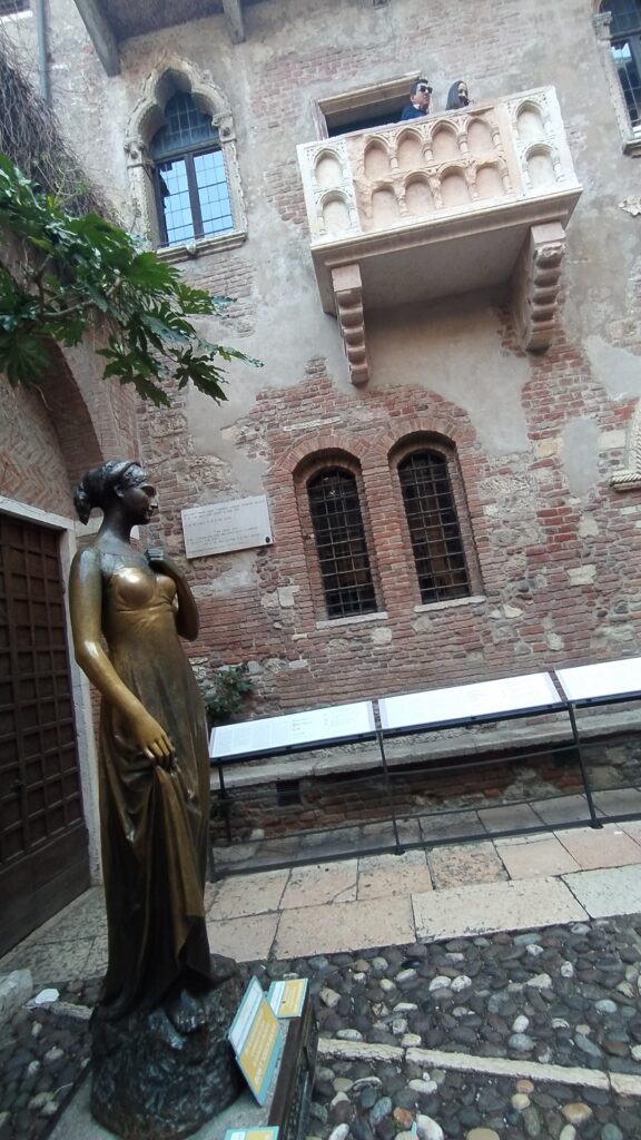 És hát mi más is lehetett volna a túra vége, mint Júlia erkélye. Úgy gondolom, hogy Verona részéről csodás gesztus, hogy megelevenítették ezt az ikonikus helyszínt az érdeklődők számára. Tudatosan, nem túl nagy elvárásokkal vártam ezt a helyszínt nehogy csalódás érjen hiszen tudtam, hogy itt biztosan tömeg lesz. Szerencsére nem volt csalódás és elöntött az emlék áradat, mert szoros kötődésem van a darabhoz így a fantáziámnak köszönhetően élveztem az ott eltöltött időt a turisták ellenére is. Színi tanulmányaim során elég mélyrehatóan foglalkoztunk a darabbal, az erkély jelenettel főleg. Vizsgán jó magam is voltam Júlia, illetve Capuletné is. Úgy gondolom az ilyen helyszínek akkor válnak igazán élménnyé, ha az ember megtölti a képzeletével, természetesen láttam ott unatkozó srácokat, akik nem értették mit keresnek ott. 😀 Szóval, ha előtte megnézed a filmet, vagy feleleveníted a story-t biztosan maradandó kis élménnyel távozol főleg, ha a pároddal mész.