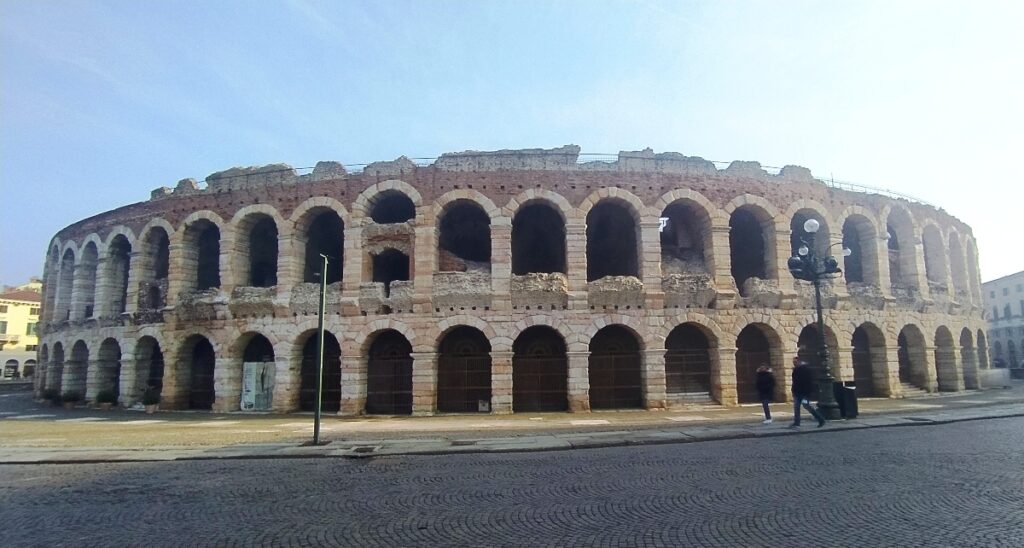A hatalmas városfal mentén haladva pedig meg is pillantottam Verona „Colosseum-át” a veronai arénát (Arena di Verona). Hasonlóképpen a „nagy tesóhoz” kb. 2000 évvel ezelőtt itt is gladiátorok küzdöttek egymással, később színházzá alakították, ma pedig otthont ad az évenként megrendezett Veronai Operafesztiválnak.