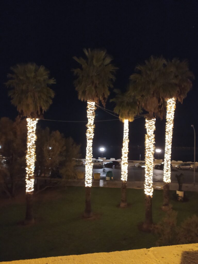 A másik dolog, hogy a várost is viszonylag későn díszítették fel. Otthon már novemberben látogatható Budapesten a karácsonyi vásár, itt csak pár napja tették fel az utcákat díszítő égősorokat. A főtéren pedig advent első vasárnapját követő hétfőn kezdtél el felállítani az itt „egzotikusnak” számító (mű)fenyőt. Ennek a kettősségnek is meg van a maga bája. Fenomenális látvány, a kedvenceim a karácsonyi díszbe öltöztetett pálmafák. Akkor döbbentem rá igazán, hogy már csak pár nap van decemberig, amikor a boltban vásárolva karácsonyi zenék szólaltak meg a rádióban.
